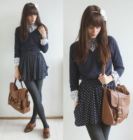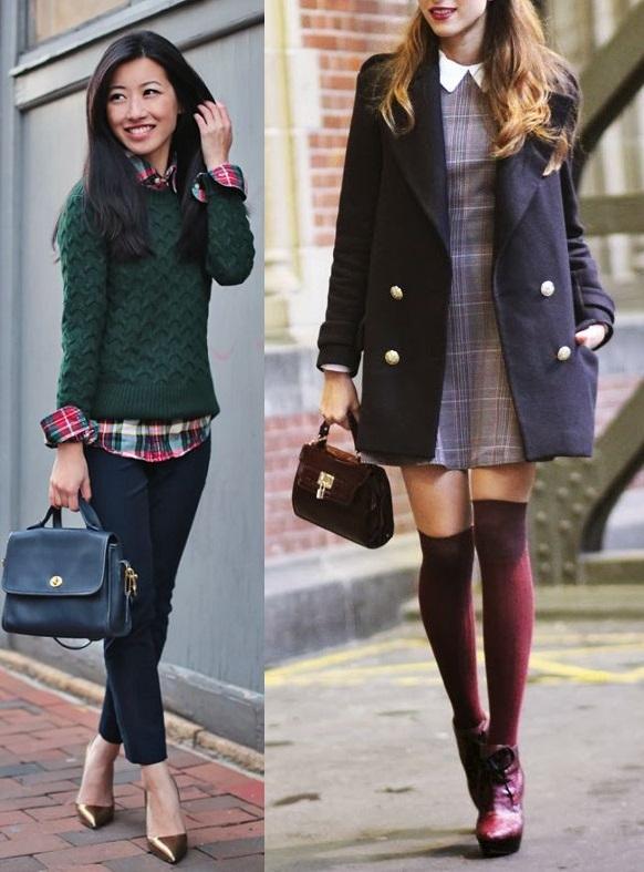 É igualmente importante saber quais as estampas e cores mais populares entre os adeptos do estilo college, para que você saiba por quais optar. É muito usado o azul marinho, bege, castanho, vinho, verde escuro... na sua maioria cores típicas de outono. Nas estampas escolha poás, formas geométricas (os losangos são os preferidos), xadrez e listras.