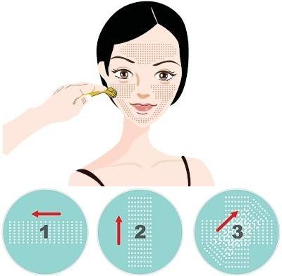 Agora deverá deslizar o instrumento na pele, sem fazer demasiada pressão para não se machucar. Deverá deslizar o dermaroller seis vezes em cada direção, horizontal, vertical, diagonal, como indicado na imagem.
