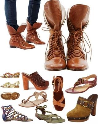 Botas de cano curto e largo ou em estilo cowboy, coturnos com cadarços ou cordões e franjas, tamancos de salto alto e sandálias rasteirinhas são peças-chave na escolha do seu boho para os pés. A maioria leva tecidos como couro e pele de animais.