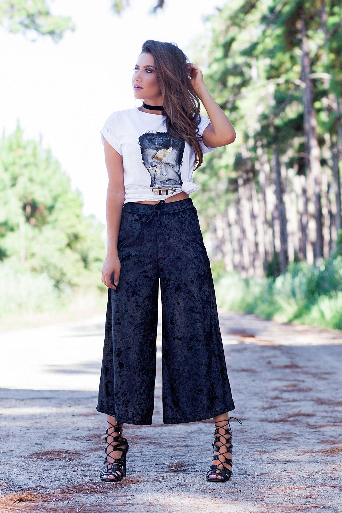 A calça pantacourt de veludo é também uma excelente escolha para criar looks de festa. A veludo é um tecido que combina bastante com a noite e traz muita elegância. Combine com camisetas ou blusinhas de tecidos mais finos e termine o look apostando no salto alto e na maquiagem com brilho e glamour.
