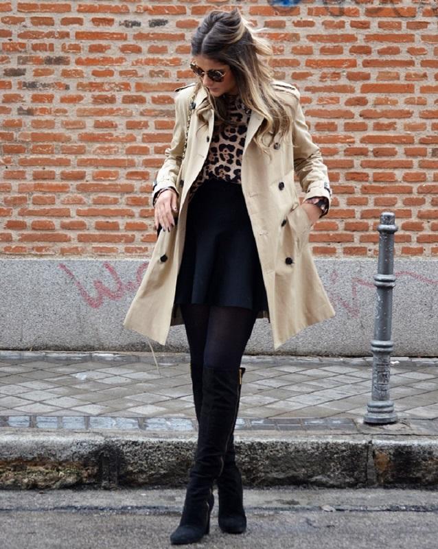 Como esta peça é tão versátil, você também pode conjugá-la com saia. Neste caso a peça deve ser do mesmo comprimento que o trench coat ou ir até ao joelho, uma saia demasiado curta ou muito comprida não resultará tão bem. Pode apostar em saias estampadas caso o trench seja liso, e os modelos que ficam melhor são o evasé, lápis e plissada. Estas dicas também são válidas para conjugar o trench coat com vestidos.
