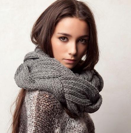 Esta é uma forma de usar um cachecol feminino que está muito na moda, pois é ótimo para qualquer estilo. Como se vê na imagem, trata-se apenas de colocar seu cachecol logo abaixo do queixo, cruzar pela parte da nuca e deixar que as pontas caiam para a frente.