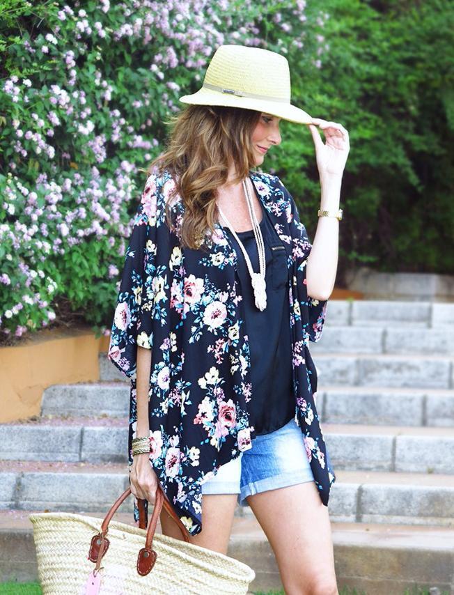 Os kimonos e as estampas orientais estão na moda e não há nada melhor que aproveitar esta estampa tão informal com um chapéu de praia para dar o toque do verão ao seu estilo. Na imagem propomos combinar o chapéu com uns shorts jeans, uma camiseta lisa e, por cima, cobrir com um kimono azulado com flores rosas. No entanto, a combinação destes elementos dependerá completamente da cor de seu kimono e de sua estampa. Lembre-se que o truque é usar o mesmo por cima de tudo, para evitar se vestir com combinações muito arriscadas.