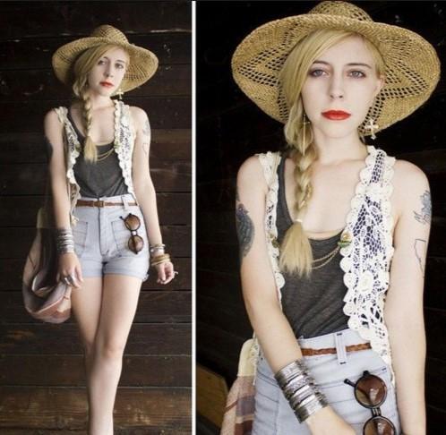 A ideia é usar shorts ou jeans que sejam com a cintura alta e complementá-los com uma camiseta básica que, evidentemente, deverá ficar por dentro da calça e, sobre ela, o nosso colete de renda. Para dar ainda mais esse toque hispter você pode usar óculos (de sol ou de grau) redondos e grandes e um chapéu como o que a garota da imagem usa. Ficará incrível.