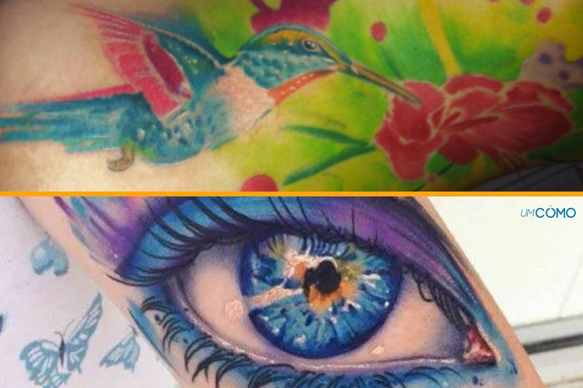 O estilo base para a aquarela pode ser praticamente qualquer um: semirealista, kawaii, geométrico, apenas aquarela, etc. O importante nesses desenhos é que a tinta se misture com água em efeito degradê, até atingir a técnica de aquarela ou watercolor como a vista em uma tela. Costumam ser vistos desenhos de cores bem vivas, mas a técnica também pode ser aplicada em tatuagens de tinta preta.