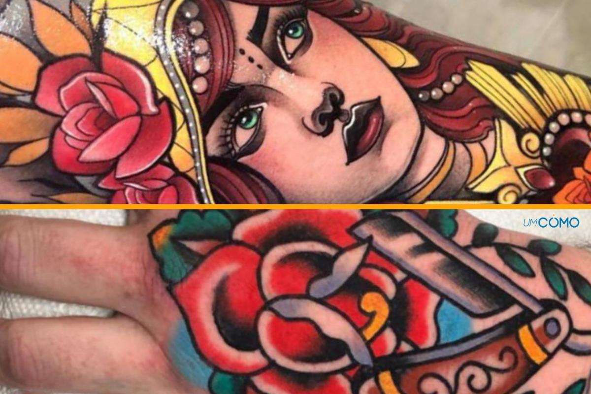 A tatuagem neotradicional é muito fácil de ser confundida com o estilo Old School, já que é a mesma, mas adaptada aos tempos atuais. Os traços são mais modernos e variam, às vezes, em efeitos borrados ou sombras suaves que dão um pouco de profundidade ao desenho. Já as cores são mais variadas que na técnica Old School e, da mesma forma, os temas são mais amplos ou até híbridos. No entanto, o estilo da velha escola ainda está lá e pode ser claramente percebido.