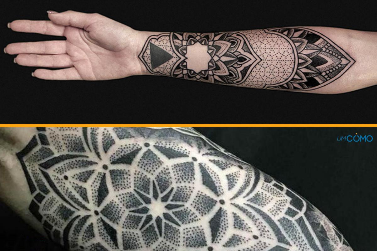 Além disso, pode ser misturado com técnicas como aquarela ou pontilhismo. Às vezes, as tatuagens geométricas mantêm linhas que lembram um esboço, dando a sensação de olhar para uma folha de desenho técnico.
