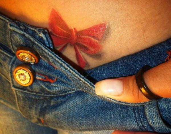 O laço traz uma representação ligada a um embrulho de presente, ou a uma decoração, como se aquela parte íntima onde o desenho do laço foi tatuado estive-se pronta para presentear.