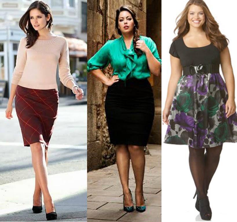 Deve usar saias retas, larguinhas e sem riscas horizontais. Deve evitar a saia lápis para que não pareça mais larga, isto porque esta saia começa a partir da cintura, dando mais enfase nessa parte do seu corpo. Também deve evitar saias godê e a saia balonê pois estes modelos de saia são mais franzidinho na cintura e na parte inferior cria um maior volume.