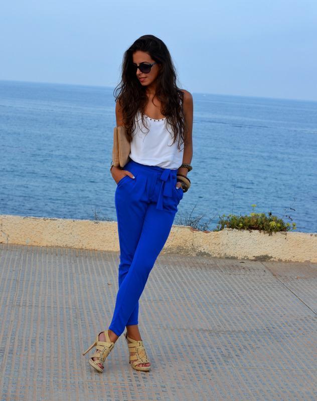 Umas das opções mais clássicas na hora de combinar umas calças azul eléctrico é a cor branca. Vai ser um sucesso de certeza! O branco fará com que a força da cor azul se destaque mais ainda.
