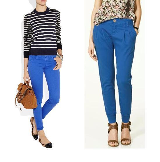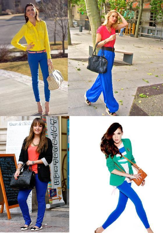 Outra das opções pouco arriscadas - mas que por isso, seguras - consiste em combinar as calças azuis eléctrico com uma camiseta ou blusa cinza ou beije. Uma vez que são cores bastante neutras, potenciará o azul.