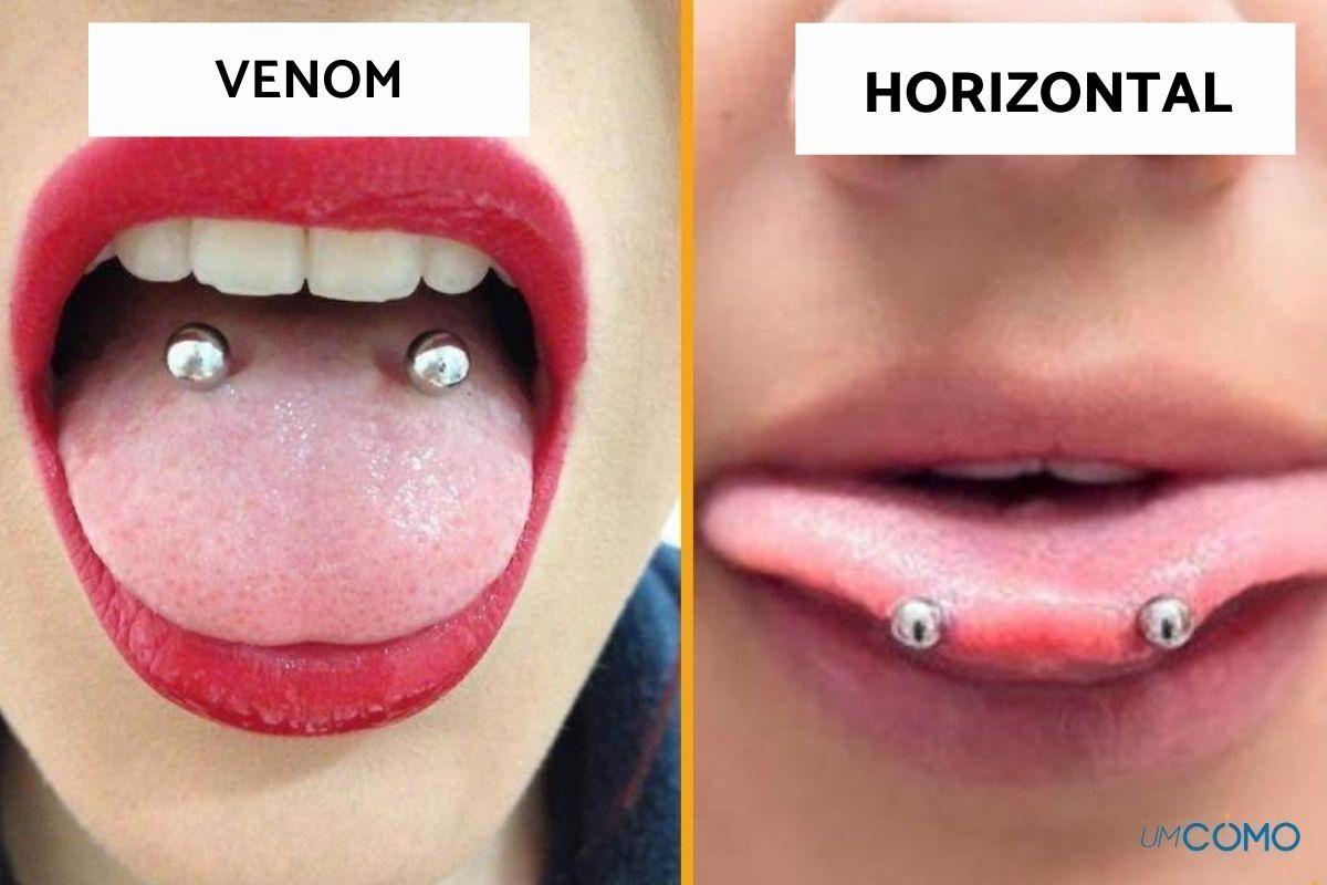 Este tipo de piercing na língua é um pouco mais intenso do que os dois anteriores. Geralmente, é posicionado na parte central da língua, assim como o tradicional. Mas, nesta ocasião, em vez de perfurar a língua de cima para baixo, trata-se de fazer duas perfurações horizontais e paralelas que ficam na zona central da língua, unidas por uma perfuração alongada e interna.