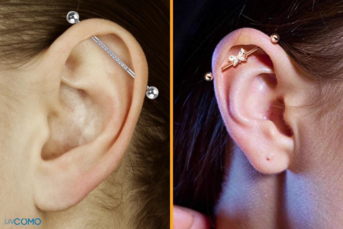 O piercing industrial foi um boom em sua época. É uma perfuração dupla que é realizada na parte superior da cartilagem. Uma barra de aço cirúrgico vai de um lado ao outro da cartilagem superior e em cada extremidade há uma perfuração que a sustenta. Sendo duas perfurações, costumam exigir muitos cuidados, mas como qualquer piercing de cartilagem, com a perseverança necessária, não seria um problema. Se você deseja obter este piercing, pode estar interessado neste outro artigo do umCOMO sobre Como cuidar de um piercing inflamado.