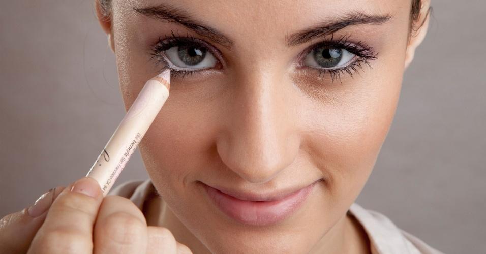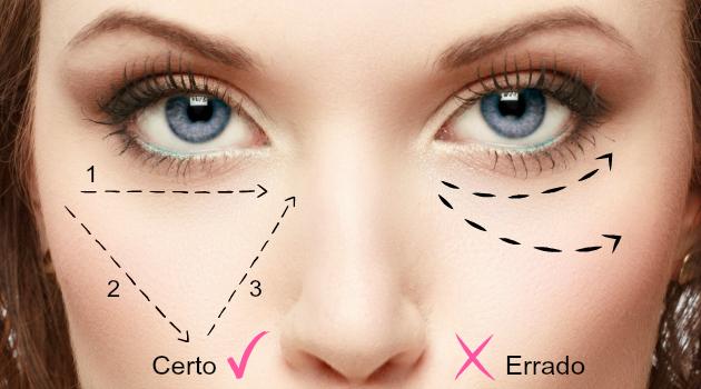 E como último truque de maquiagem para olhos, corrija as olheiras. O tom amarronzado das olheiras torna o olhar menor, então o truque é passar corretivo antes ou depois de fazer a maquiagem de olhos. O corretivo deve ser aplicado em forma de triângulo, como mostra a imagem.