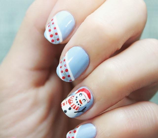 Esta é outra das decorações de unhas para o Natal que gostamos. A ideia é fazer uma manicure de inverno que tenha como protagonista um boneco de neve com um gorro de Papai Noel. Como desenhar um boneco de neve em todas as unhas pode dar bastante trabalho e ser difícil, uma ótima opção é fazê-lo apenas numa unha e pintar as restantes com cores natalinas e que nos lembram a época de inverno, como o azul celeste, o branco e o vermelho.