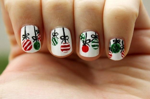 Uma das tradições mais enraizadas nas festas de natal é montar a árvore de Natal em casa, e para que fique espetacular colocarmos todo o tipo de enfeites, sejam bolas, laços, estrelas, sinos, luzes, festões, etc. Neste caso, as suas unhas podem ser o centro de atenção com um desenho que consiste em desenhar umas bolas de Natal suspensas. O truque para que se adapte a esta época do ano é usar cores como o vermelho, o verde, o preto e o branco.