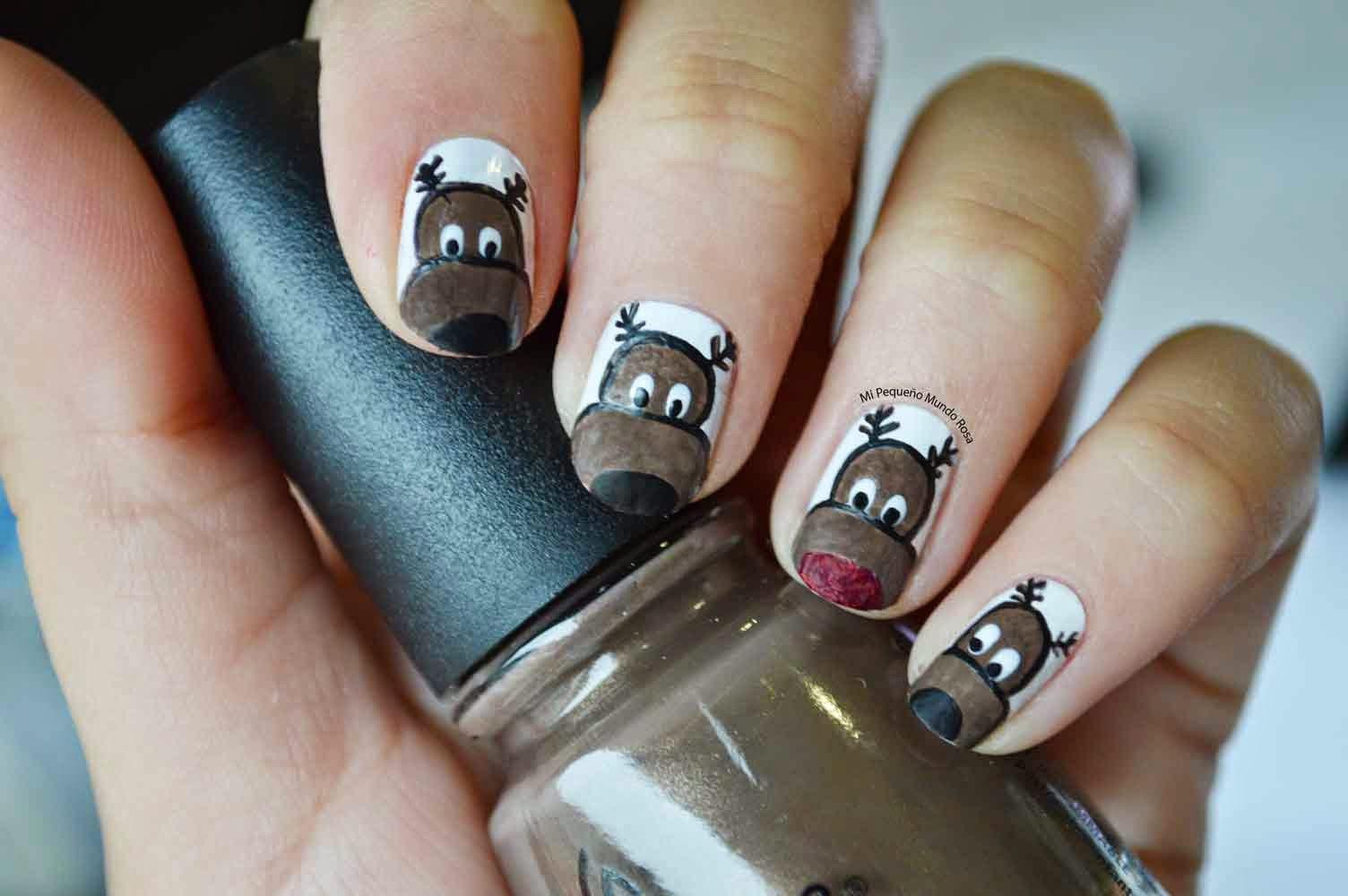 Se gosta dos desenhos divertidos e criativos, este pode ser ideal para usar nas festas de fim de ano. Propomos que desenhe a cara de uma simpática rena de Papai Noel nas suas unhas. Para isso, deverá aplicar primeiro uma camada de esmalte branco e, de seguida fazer a cara da rena com um esmalte marrom e desenhar os pequenos detalhes como os chifres e o nariz com um esmalte preto. O resultado é surpreendente!